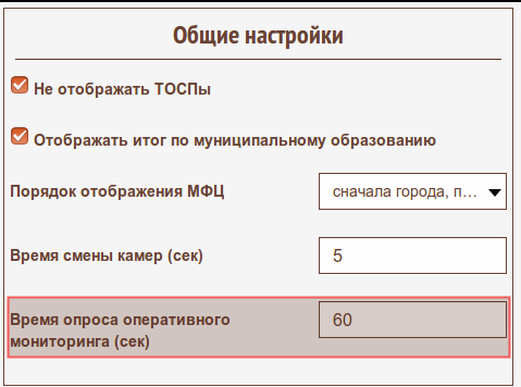 Добавлена настройка времени запроса оперативного мониторинга в секундах. Форма оперативного мониторинга будет автоматически обновляться через указанное время. Если МФЦ ответило то при наведении на название МФЦ будет показано время последнего успешного обновления
