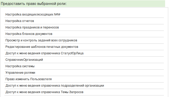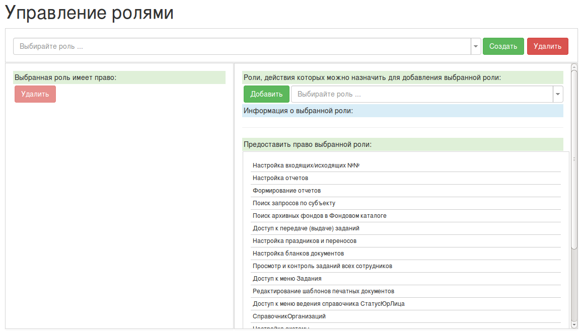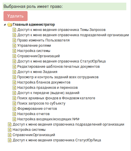 Форма управления ролями позволяет создавать свои наборы ролей пользователя. Каждое действие в программе имеет свои "права" доступа. Роль комбинируется из набора "прав" и других ролей.