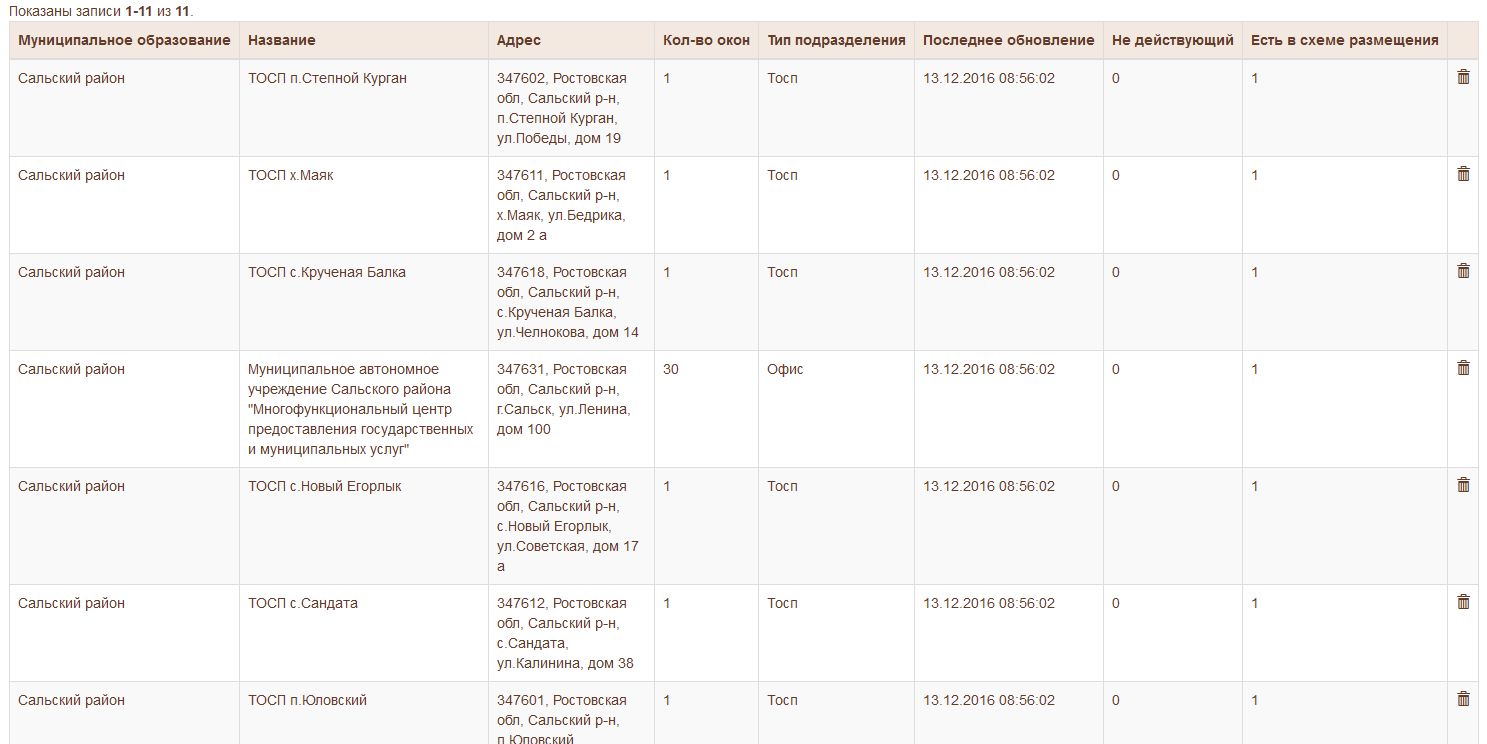 мы можем увидеть информацию о названии, адресе месторасположения офиса/тоспа, количестве окон, дате последнего обновления информации по данному офису/тоспу или при необходимости удалить эту информацию, нажав на