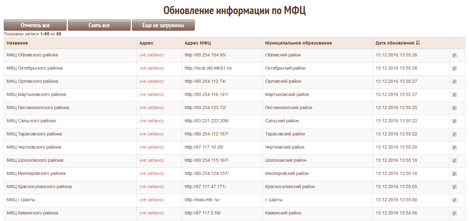 происходит обновление информации по каждому МФЦ в данный период времени, при этом есть возможность просмотреть как загружается информация из МФЦ, с возможностью просмотра результата обновления