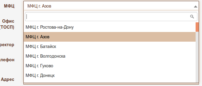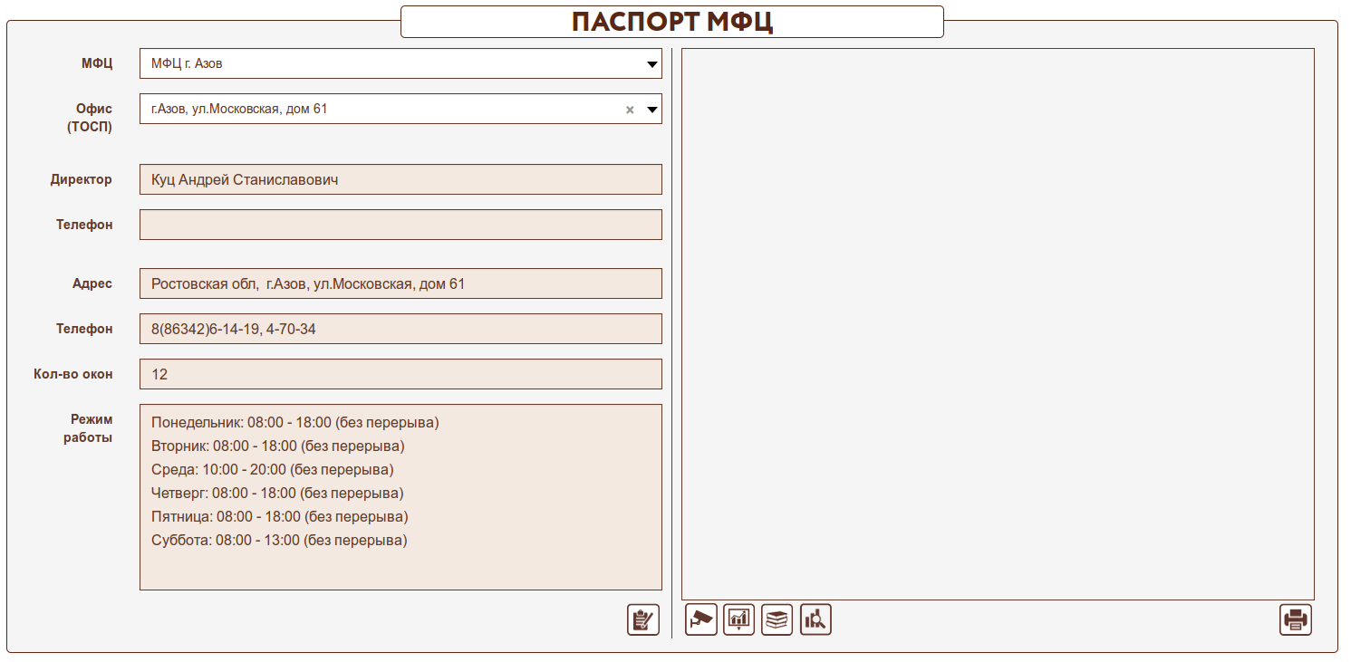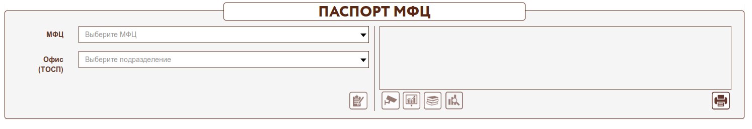 Паспорт МФЦ позволяет просмотреть информацию по каждому обособленному подразделению в МФЦ. Для просмотра информации необходимо выбрать МФЦ и офис(тосп).