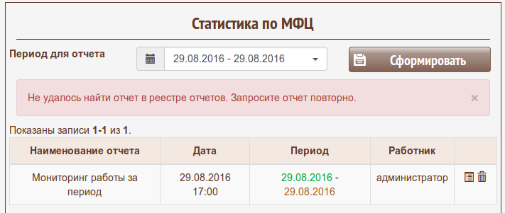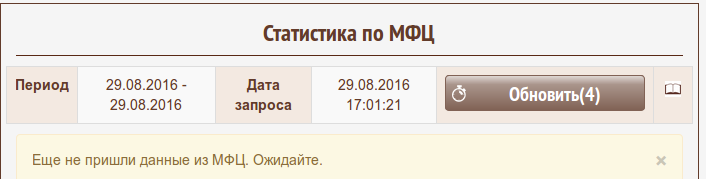 Пока данные не придут с МФЦ отчет будет не доступен. После получени данных форма автоматически будет обновлена