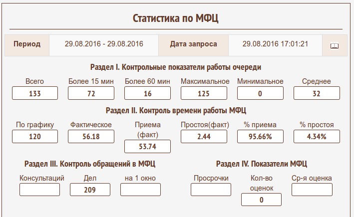 Форма просмотра статистики работает в интерактивном режиме. Доступны отчеты которые уже были запрошены в МФЦ. При запросе нового отчета будет отправлен запрос к МФЦ для сбора данных.