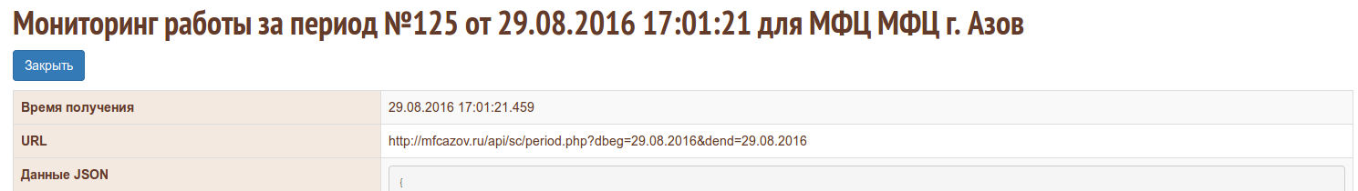 Для более детального анализа данных можно перейти на просмотр информации которая пришла от МФЦ. В ней будет видно время получения данных от МФЦ, строка запроса, и JSON данные.