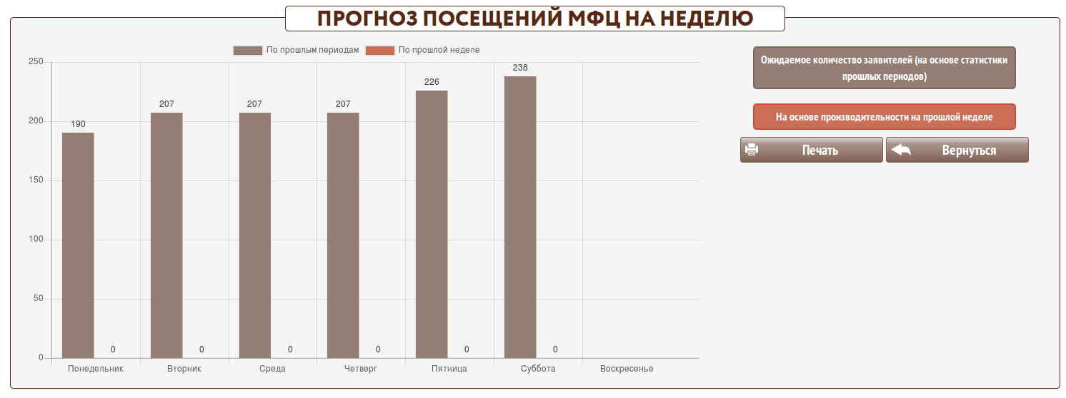 Прогноз посещений на неделю позволяет позволяет построить прогноз на будущую неделю согласно статистики на основании прошлых периодов. и на основании производительности прошлой недели.