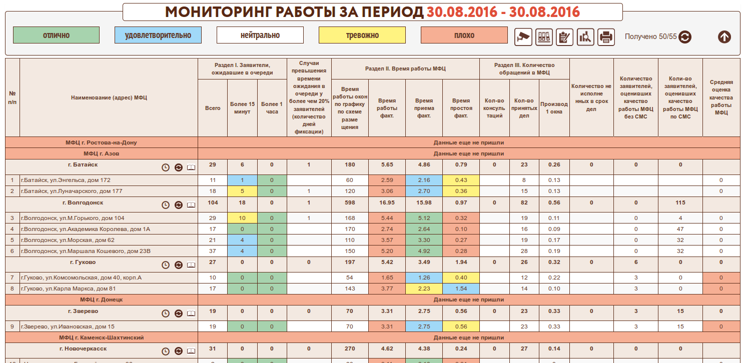 При открытии отчета откроется форма в которой будут данные по уже ответившим МФЦ. Также будут отмечены МФЦ из которых данные еще не поступили или при опросе которых возникли проблемы.