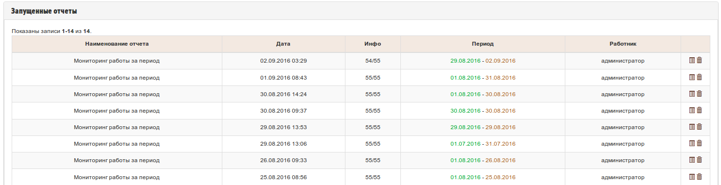 Оператор может открыть любой отчет из запущенных или удалить, если данный отчет больше не нужен.